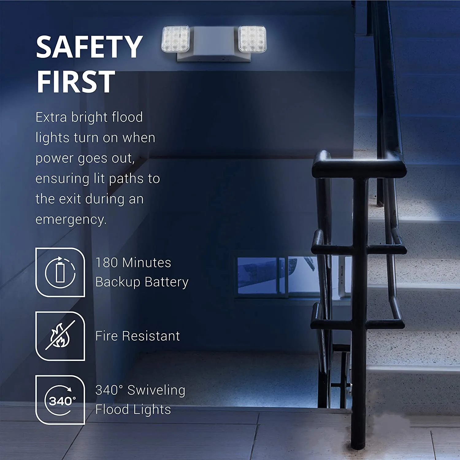 SAFETY FIRST - Our emergency light has bright adjustable (360 degrees) floodlights on each side for maximum visibility. In case of a power outage, the backup battery automatically illuminates (180 minutes) the fixture and lights the way to safety.