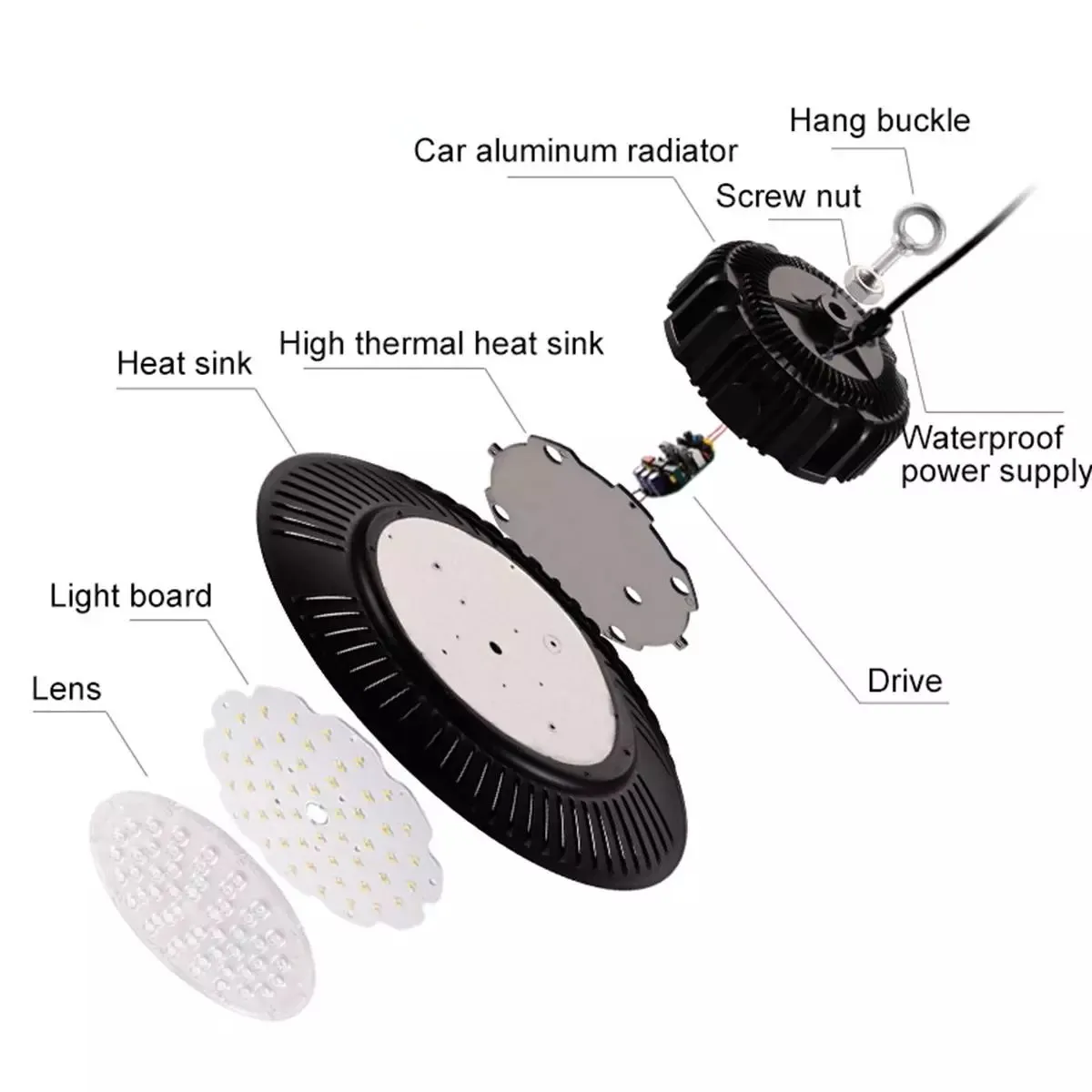 Features: - Powerful performance: The design of Die-cast aluminum is more efficient and more rapid heat dissipation, greatly reducing source temperature. Its LED chips and driver to ensure long lifespan and stable performance. - Best LED, use original quality LED source. - Greater illumination area: 50W/ 100W/ 150W/ 200W Daylight with a 120° beam angle. Provide long lifespan and stable performance. - Application scenario: IP66 Waterproof for use in environments such as rain, snow, fog, etc.The high bay led lighting can be used in outdoor and indoor. Great for use in residential and commercial settings to illuminate workstations, warehouse, garages, workshops, exhibition halls, alleys, parking lots and more.