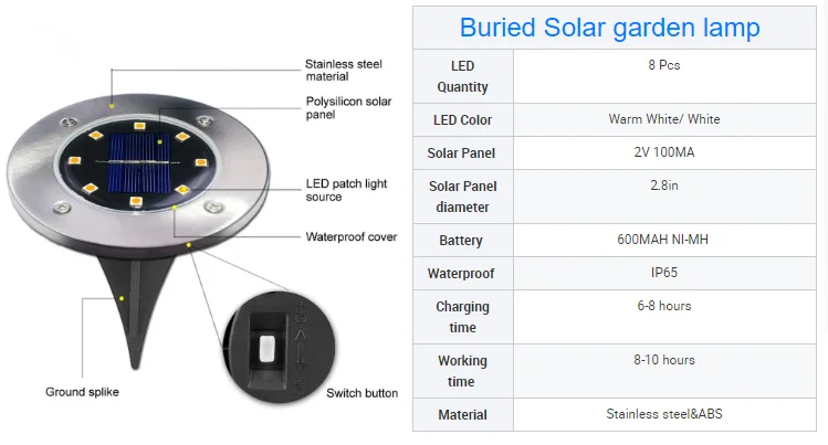 Single package size: 13X12 cm.Package type: solar power light sensor landscape lawn lamp buried light for garden path floor lights LED solar yard lamp Package: 96 pcs / carton