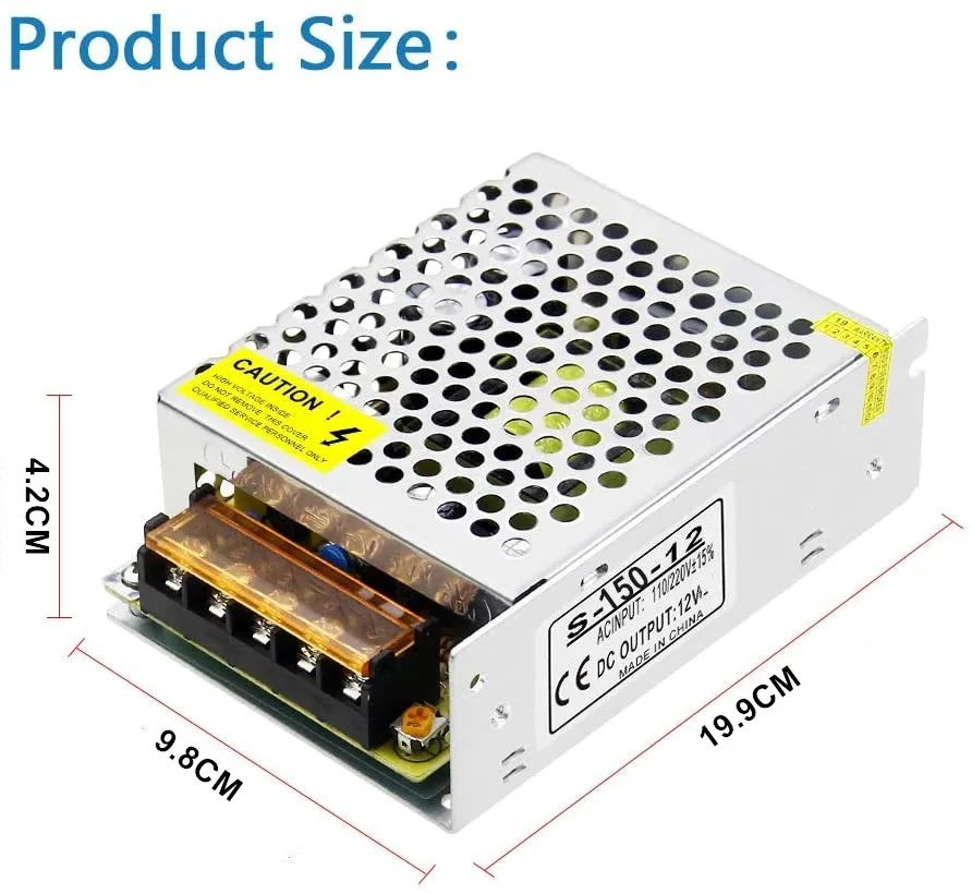 * Universal switching mode power supply. Input: AC 110V~ 220V, 50 / 60Hz ; Output: DC 12V, Max 12.5A 150W. Two output ports. Each port outputs 0~12.5A automatically, 12.5A max in total for 2 ports. The default output voltage is 12V, but it can be regulated by 10%, from 10.8V to 13.2V.