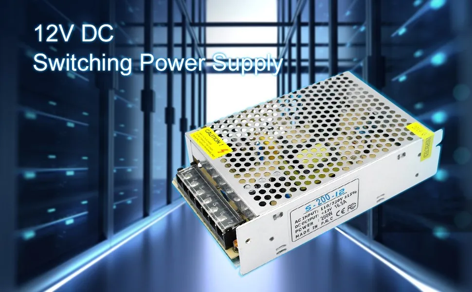 * Universal switching mode power supply. Input: AC 110V~ 220V, 50 / 60Hz ; Output: DC 12V, Max 16.5A 200W. Two output ports. Each port outputs 0~16.5A automatically, 16.5A max in total for 2 ports. The default output voltage is 12V, but it can be regulated by 10%, from 10.8V to 13.2V.